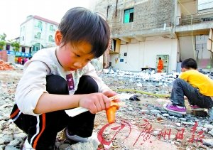 盈江震后生活逐漸恢復(fù)正常,一個小朋友在震后的街道上幫媽媽削胡蘿卜。